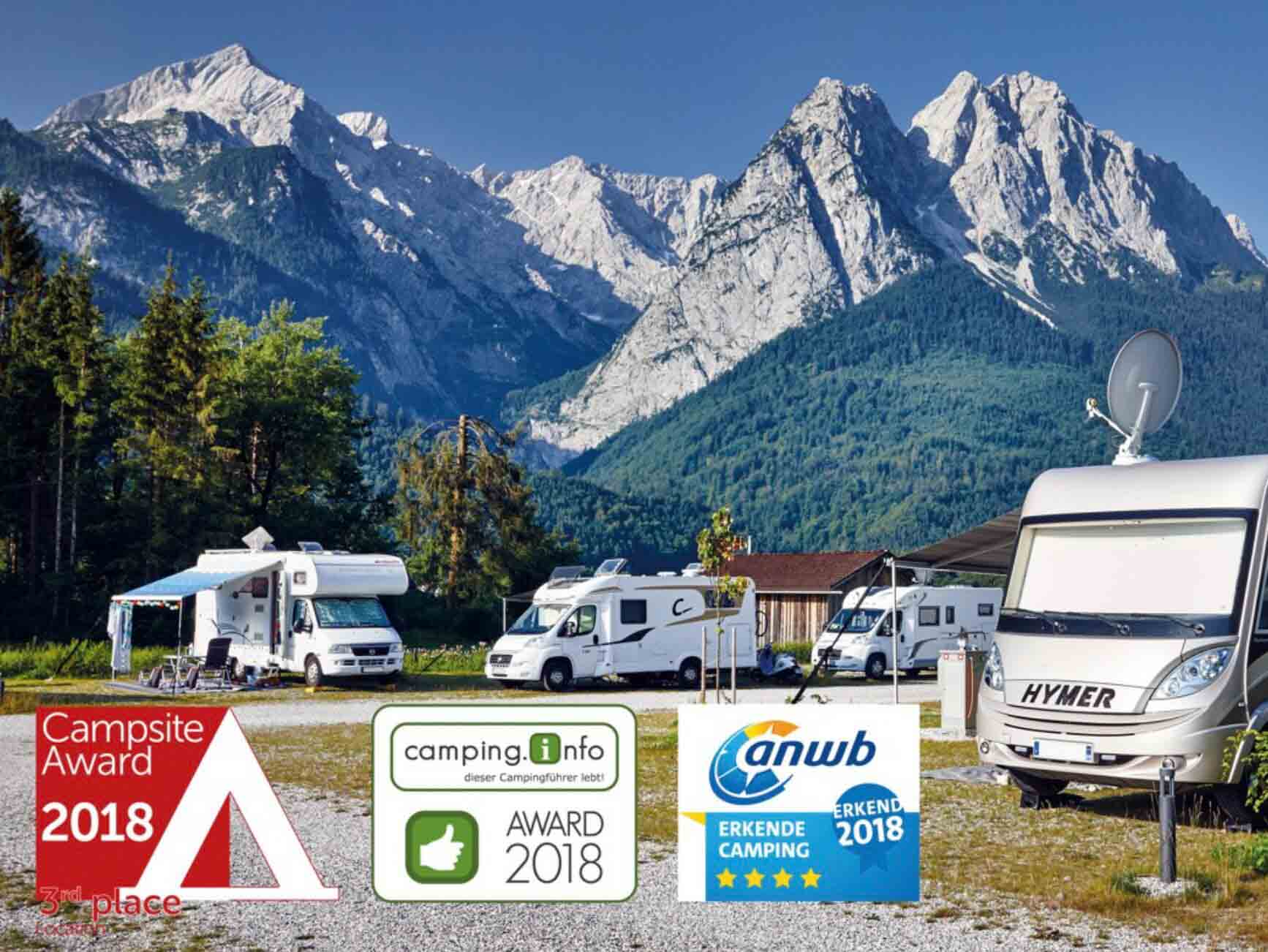 The Camping Resort Zugspitze in Grainau continues its success story and is once again ranked among the best campsites in Germany. At the 2018 Campsite Awards, the resort took third place in the “Location” category and was recognized for its special location at the foot of the Zugspitze. In addition to the audience award, the resort can also celebrate receiving the “ANWB Recommended Campsite” rating for the first time – awarded by the largest camping association in the Netherlands.