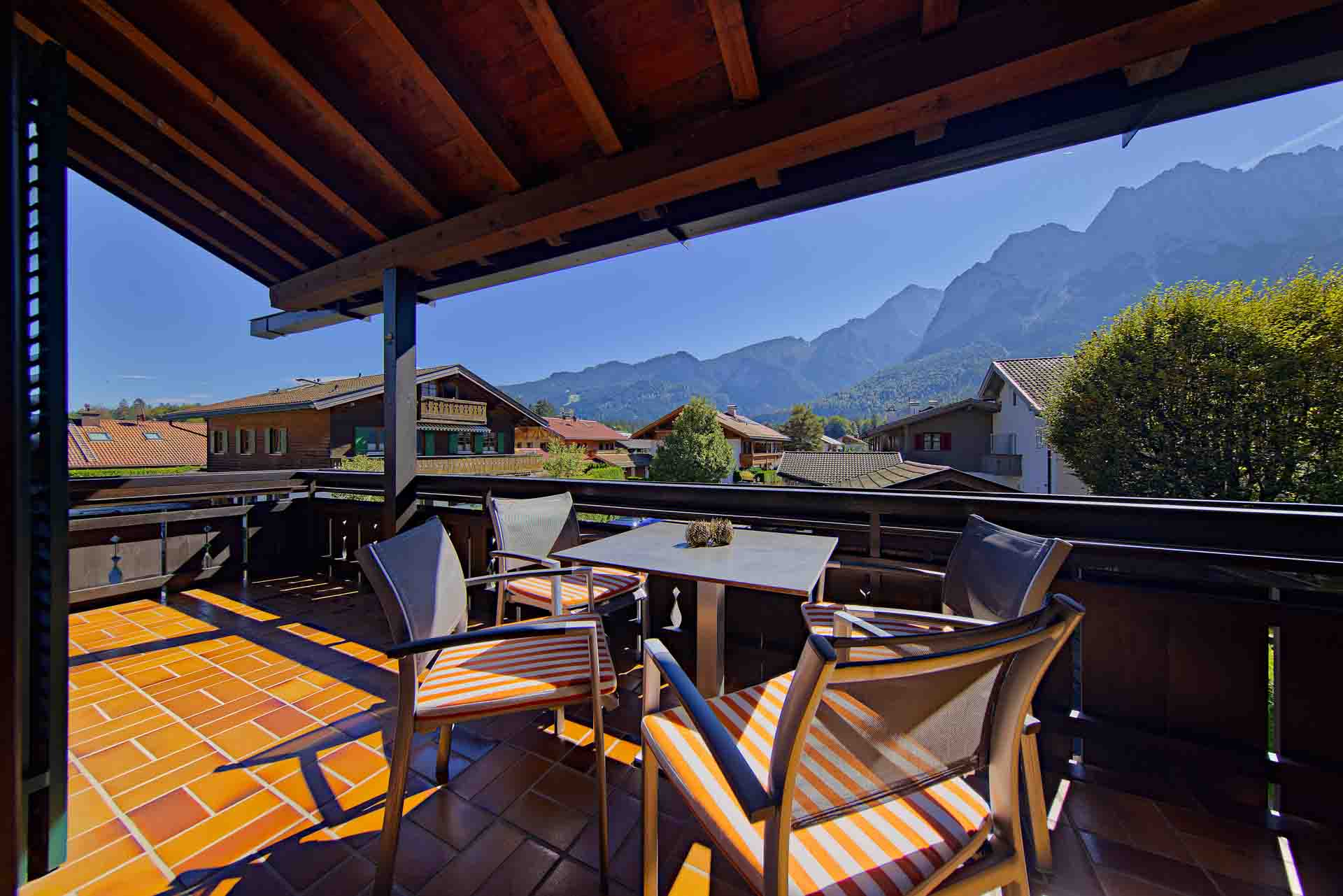 A particular highlight is the furnished balcony, which extends across two sides of the building and offers impressive panoramic views of the Alps. The exclusive amenities also include a JURA coffee machine, Wi-Fi, TV, and private parking.